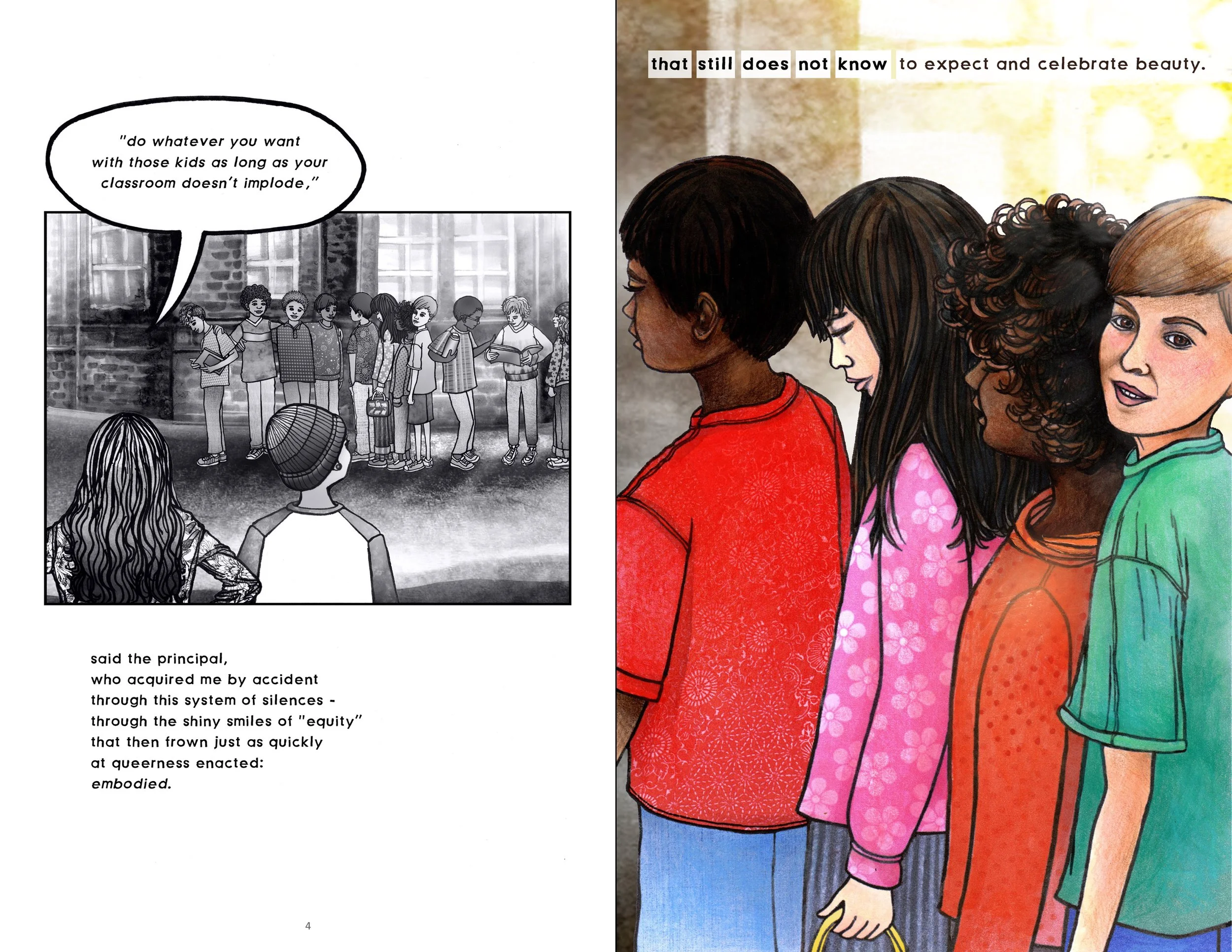 This series of graphic stories is a large component of my PhD dissertation titled; To Do This Discussion Differently: Queering teacher professional learning through comic art and graphic stories. The first three of (eventually) four, connected graphic stories form the “results” chapters of that thesis document. The fourth book in the series can be more accurately described as one-part “choose your own adventure”, and many-parts identity workbook. It will be an expression of the slower, more introspective, and also more action-oriented approach to Teacher Professional Learning (TPL) that my thesis aims to encourage through both form and function. My preparatory research and plans for book four compose much of the final chapter of my dissertation, which also addresses the broader impact and next steps of this work in general.